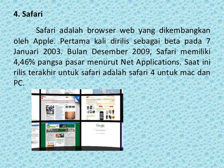 - 10. 4. Safari Safari adalah browser web yang dikembangkanoleh Apple. Pertama kali dirilis sebagai beta pada 7Januari 2003. Bulan Desember 2009, Safari memiliki4,46% pangsa pasar menurut Net Applications. Saat inirilis terakhir untuk safari adalah safari 4 untuk mac danPC.