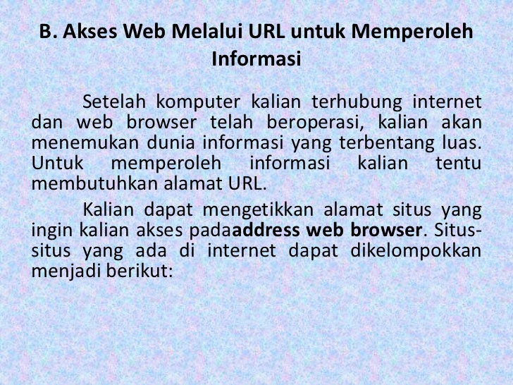 - 11. B. Akses Web Melalui URL untuk Memperoleh Informasi Setelah komputer kalian terhubung internetdan web browser telah beroperasi, kalian akanmenemukan dunia informasi yang terbentang luas.Untuk memperoleh informasi kalian tentumembutuhkan alamat URL. Kalian dapat mengetikkan alamat situs yangingin kalian akses padaaddress web browser. Situs-situs yang ada di internet dapat dikelompokkanmenjadi berikut: