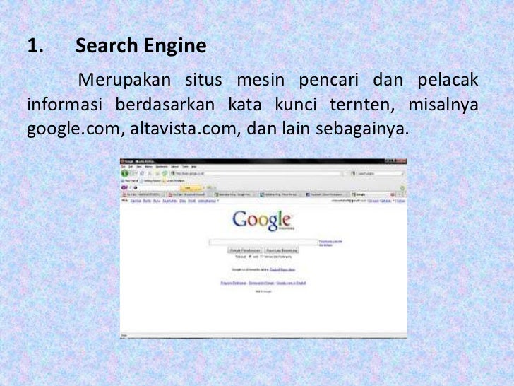 - 12. 1. Search Engine Merupakan situs mesin pencari dan pelacakinformasi berdasarkan kata kunci ternten, misalnyagoogle.com, altavista.com, dan lain sebagainya.