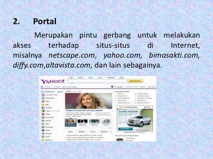- 13. 2. Portal Merupakan pintu gerbang untuk melakukanakses terhadap situs-situs di Internet,misalnya netscape.com, yahoo.com, bimasakti.com,diffy.com,altavista.com, dan lain sebagainya.
