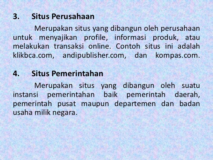 - 14. 3. Situs Perusahaan Merupakan situs yang dibangun oleh perusahaanuntuk menyajikan profile, informasi produk, ataumelakukan transaksi online. Contoh situs ini adalahklikbca.com, andipublisher.com, dan kompas.com.4. Situs Pemerintahan Merupakan situs yang dibangun oleh suatuinstansi pemerintahan baik pemerintah daerah,pemerintah pusat maupun departemen dan badanusaha milik negara.