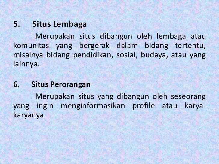- 15. 5. Situs Lembaga Merupakan situs dibangun oleh lembaga ataukomunitas yang bergerak dalam bidang tertentu,misalnya bidang pendidikan, sosial, budaya, atau yanglainnya.6. Situs Perorangan Merupakan situs yang dibangun oleh seseorangyang ingin menginformasikan profile atau karya-karyanya.