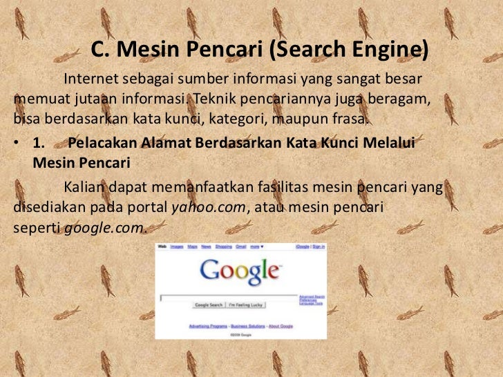 - 16. C. Mesin Pencari (Search Engine) Internet sebagai sumber informasi yang sangat besarmemuat jutaan informasi. Teknik pencariannya juga beragam,bisa berdasarkan kata kunci, kategori, maupun frasa.• 1. Pelacakan Alamat Berdasarkan Kata Kunci Melalui Mesin Pencari Kalian dapat memanfaatkan fasilitas mesin pencari yangdisediakan pada portal yahoo.com, atau mesin pencariseperti google.com.