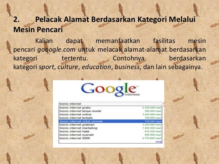 - 17. 2. Pelacak Alamat Berdasarkan Kategori MelaluiMesin Pencari Kalian dapat memanfaatkan fasilitas mesinpencari gooogle.com untuk melacak alamat-alamat berdasarkankategori tertentu. Contohnya berdasarkankategori sport, culture, education, business, dan lain sebagainya.
