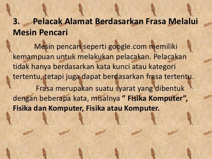 - 18. 3. Pelacak Alamat Berdasarkan Frasa MelaluiMesin Pencari Mesin pencari seperti google.com memilikikemampuan untuk melakukan pelacakan. Pelacakantidak hanya berdasarkan kata kunci atau kategoritertentu, tetapi juga dapat berdasarkan frasa tertentu. Frasa merupakan suatu syarat yang dibentukdengan beberapa kata, misalnya ” Fisika Komputer”,Fisika dan Komputer, Fisika atau Komputer.