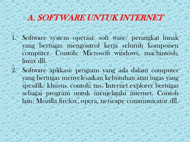 - 2. A. SOFTWARE UNTUK INTERNET1. Software system operasi: soft ware/ perangkat lunak yang bertugas mengontrol kerja seluruh komponen computer. Contoh: Microsoft windows, machintosh, linux dll.2. Software aplikasi: program yang ada dalam computer yang bertugas menyelesaikan kebutuhan atau tugas yang spesifik/ khusus. contoh: ms. Internet explorer bertugas sebagai program untuk menjelajahi internet. Contoh lain: Mozilla firefox, opera, netscape communicator dll.