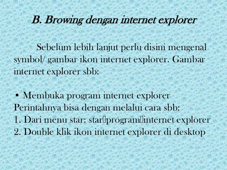 - 3. B. Browing dengan internet explorer Sebelum lebih lanjut perlu disini mengenalsymbol/ gambar ikon internet explorer. Gambarinternet explorer sbb:• Membuka program internet explorerPerintahnya bisa dengan melalui cara sbb:1. Dari menu star: star program internet explorer2. Double klik ikon internet explorer di desktop