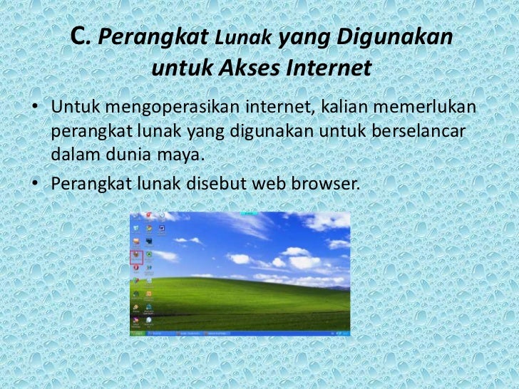 - 4. C. Perangkat Lunak yang Digunakan untuk Akses Internet• Untuk mengoperasikan internet, kalian memerlukan perangkat lunak yang digunakan untuk berselancar dalam dunia maya.• Perangkat lunak disebut web browser.