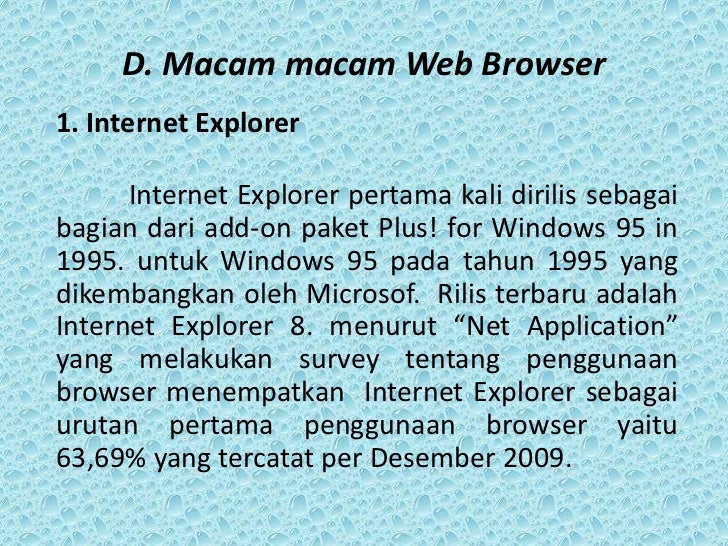 - 5. D. Macam macam Web Browser1. Internet Explorer Internet Explorer pertama kali dirilis sebagaibagian dari add-on paket Plus! for Windows 95 in1995. untuk Windows 95 pada tahun 1995 yangdikembangkan oleh Microsof. Rilis terbaru adalahInternet Explorer 8. menurut “Net Application”yang melakukan survey tentang penggunaanbrowser menempatkan Internet Explorer sebagaiurutan pertama penggunaan browser yaitu63,69% yang tercatat per Desember 2009.