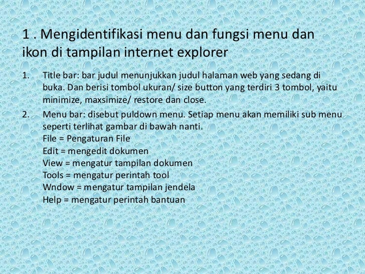 - 6. 1 . Mengidentifikasi menu dan fungsi menu danikon di tampilan internet explorer1. Title bar: bar judul menunjukkan judul halaman web yang sedang di buka. Dan berisi tombol ukuran/ size button yang terdiri 3 tombol, yaitu minimize, maxsimize/ restore dan close.2. Menu bar: disebut puldown menu. Setiap menu akan memiliki sub menu seperti terlihat gambar di bawah nanti. File = Pengaturan File Edit = mengedit dokumen View = mengatur tampilan dokumen Tools = mengatur perintah tool Wndow = mengatur tampilan jendela Help = mengatur perintah bantuan