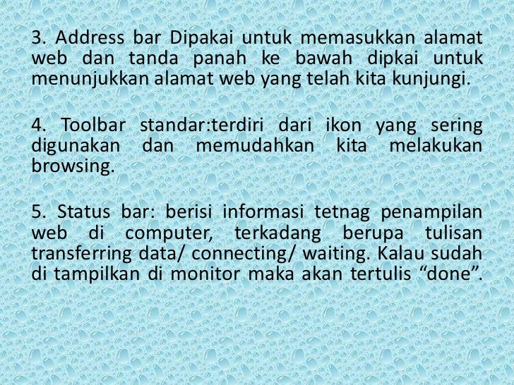 - 7. 3. Address bar Dipakai untuk memasukkan alamatweb dan tanda panah ke bawah dipkai untukmenunjukkan alamat web yang telah kita kunjungi.4. Toolbar standar:terdiri dari ikon yang seringdigunakan dan memudahkan kita melakukanbrowsing.5. Status bar: berisi informasi tetnag penampilanweb di computer, terkadang berupa tulisantransferring data/ connecting/ waiting. Kalau sudahdi tampilkan di monitor maka akan tertulis “done”.