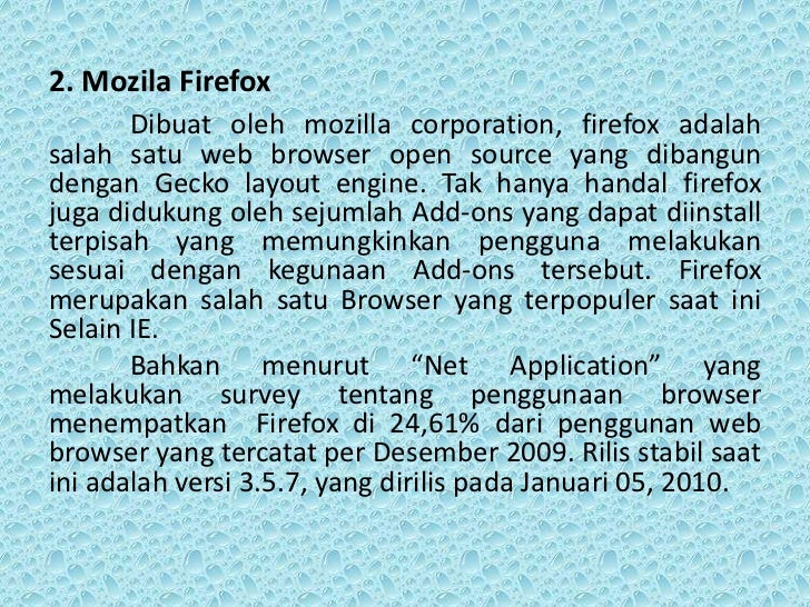 - 8. 2. Mozila Firefox Dibuat oleh mozilla corporation, firefox adalahsalah satu web browser open source yang dibangundengan Gecko layout engine. Tak hanya handal firefoxjuga didukung oleh sejumlah Add-ons yang dapat diinstallterpisah yang memungkinkan pengguna melakukansesuai dengan kegunaan Add-ons tersebut. Firefoxmerupakan salah satu Browser yang terpopuler saat iniSelain IE. Bahkan menurut “Net Application” yangmelakukan survey tentang penggunaan browsermenempatkan Firefox di 24,61% dari penggunan webbrowser yang tercatat per Desember 2009. Rilis stabil saatini adalah versi 3.5.7, yang dirilis pada Januari 05, 2010.